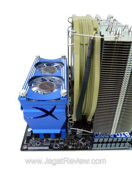 Karena masih menyisakan ruang yang cukup lega, kami pun mencoba untuk memasangkan kipas pendingin tambahan Hyper-X untuk RAM tersebut dan seperti perkiraan kami sebelumnya, kami tidak perlu memaksakan kipas tersebut agar muat pada tempatnya. Tampaknya tagline “Fill Your Memory Slots” sungguh memberikan kesan tersendiri bagi pengguna memory yang memiliki heatspreader tinggi.