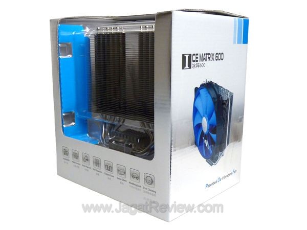 Produsen heatsink asal China ini datang dengan kemasan box silver mengilap yang cukup menarik. Anda dapat melihat langsung heatsink ini secara keseluruhan tanpa harus mengeluarkannya dari kotak. Tercantum pula spefisikasi dari heatsink, kipas, dan feature-feature yang terdapat dalam heatsink ini. Box seperti ini sangat menarik bagi kami karena terlihat mewah dibandingkan kemasan pada umumnya.