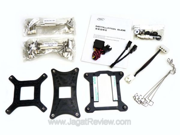 Walau mounting yang disediakan termasuk lengkap untuk platform Intel dan AMD, uniknya DeepCool hanya menyertakan backplate untuk platform Intel LGA 775 dan 115x. Untuk platform Intel LGA 1366, DeepCool hanya memberikan empat kaki penahan untuk diletakkan di belakang mobo seperti yang terlihat pada gambar.