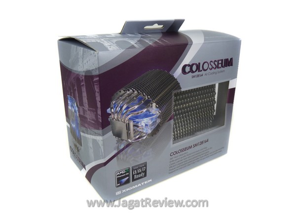 Pada kemasan luar, Anda dapat mengintip ke dalam untuk melihat sekilas bentuk dari Xigmatek Colloseum. Selain itu terdapat beberapa penjelasan mengenai spesifikasi heatsink ini dan juga kompatibilitas socket prosesor yang didukung.Beberapa perlengkapan yang akan Anda dapatkan dalam paket penjualan, antara lain: