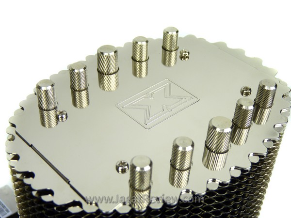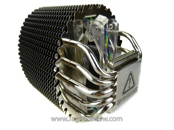 Inilah tampilan heatsink Xigmatek dengan penerapan Dual Layer H.D.T. Heatsink ini dipenuhi sirip aluminium dengan bagian dasar heatpipe yang berbahan dasar tembaga. Tampak dari atas jumlah heatpipe heatsink ini sebanyak 6 buah.