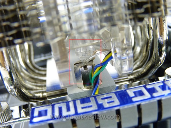 Entah hal ini terjadi karena kesalahan desain atau kebetulan saja, saat kami memasang dan mengunci fan pada tempatnya, sebuah LED pada kipas menempel langsung pada mur pengunci heatsink sehingga menyebabkan LED tersebut menjadi tidak menyala karena kemungkinan short yang terjadi. Kami sempat mencoba kipas tersebut dengan orientasi yang berbeda namun tetap saja salah satu LED akan menempel dengan mur pengunci heatsink tersebut.